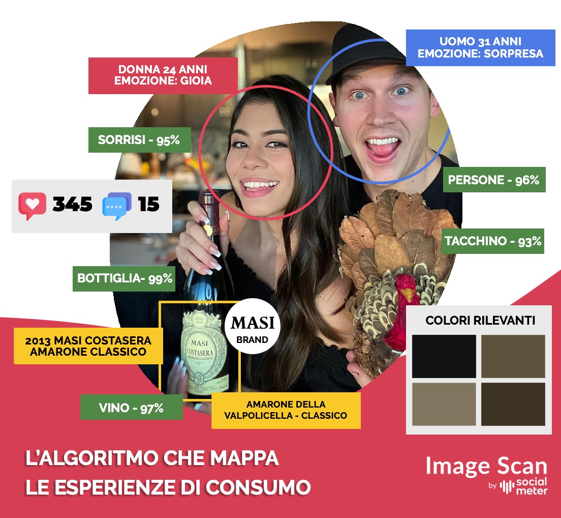 Utilizzando Image Scan, il servizio di Image Analytics della piattaforma SocialMeter Suite, in quattro anni sono state mappate circa 260.000 immagini. Grazie alle reti neurali convoluzionali (CNN) e alle feature di riconoscimento oggetti, rilevamento facciale e riconoscimento ottico dei caratteri, l’analisi ha estrapolato da ciascuna immagine fino a 150 livelli di informazione, inclusi insight tratti dalle etichette (cantina, prodotto, annata). Sono stati raccolti dettagli su contesto di consumo, abbinamenti preferiti, caratteristiche di diversi segmenti di consumatori (genere, età, sentiment) e posizionamento rispetto ai competitor.